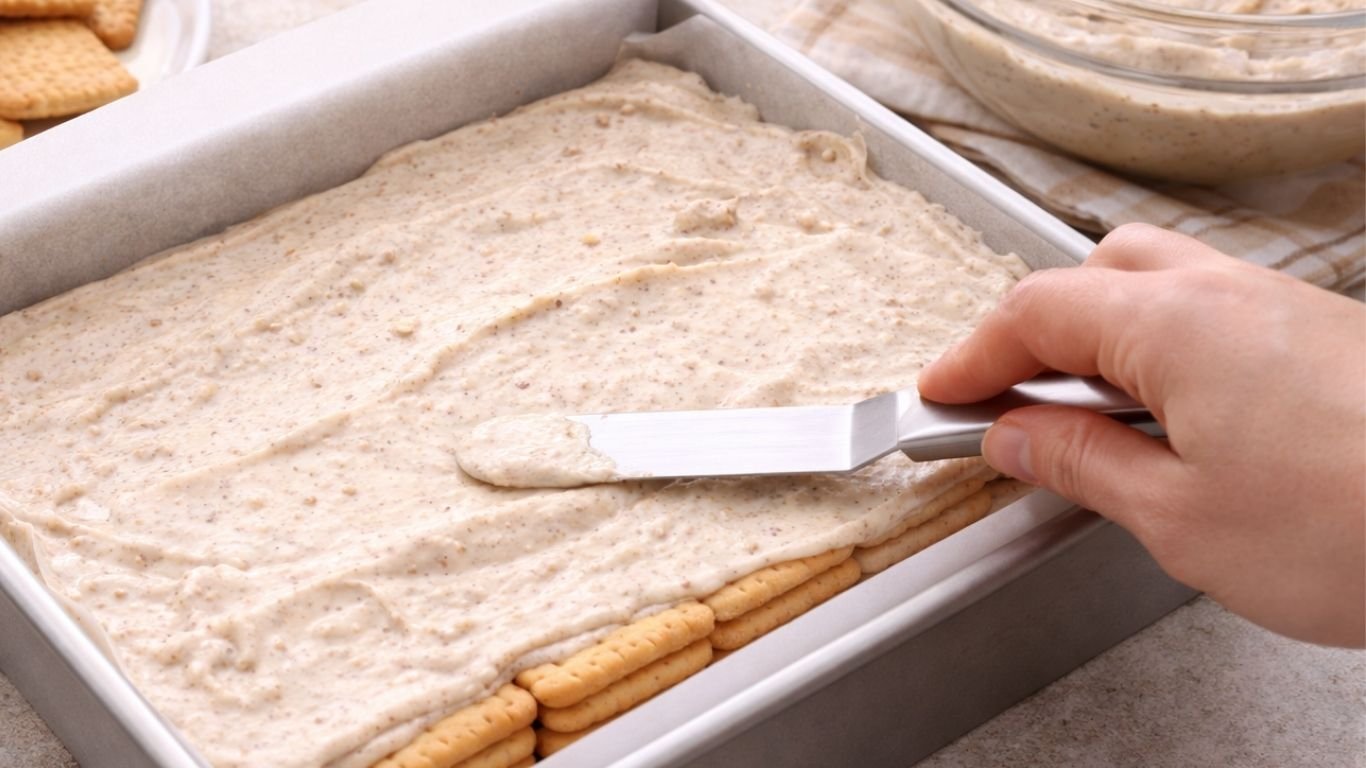 Kalup obložim papirom za pečenje kako bih kasnije bez problema izvadila kolač i dobila lijepe, čiste ivice. Kekse kratko umočim u mlijeko – samo par sekundi, dovoljno da omekšaju, ali da zadrže formu. Ako ih previše natopim, izgubiće strukturu i to uvijek pokušavam izbjeći. Složim prvi red keksa, zatim preko njega rasporedim sloj kreme i lagano poravnam špatulom. Trudim se da slojevi budu ujednačeni jer se to kasnije vidi prilikom rezanja. Postupak ponavljam dok ne potrošim sve sastojke, a završavam slojem kreme jer tada kolač izgleda urednije i spremno za završni preliv.