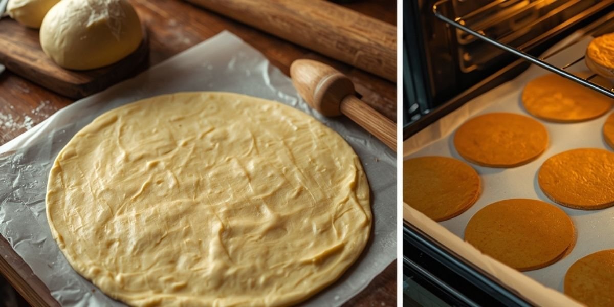 Podijelite tijesto na 10 jednakih dijelova. Svaki dio razvaljajte na papir za pečenje debljine 2 mm i izrežite krug promjera 18 cm. Pecite svaku koru u prethodno zagrijanoj rerni na 180°C oko 7–8 minuta dok ne postane zlatno-smeđa i suha. Ohladite kore na sobnoj temperaturi.